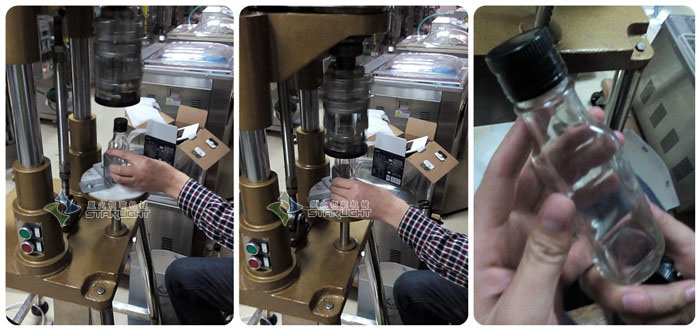 星火陜西旋蓋機所提供的這款酒瓶半自動旋蓋機屬于半自動操作設備之一,因此在實現(xiàn)玻璃瓶金屬管旋蓋之時,需要人工配蓋和人工進出瓶的;上圖就是星火陜西旋蓋機提供的酒瓶半自動旋蓋機實現(xiàn)旋蓋工作的一個簡易過程,左邊的圖是人工把已經(jīng)蓋上蓋子的瓶子放在旋蓋頭下的托板卡位處,中間的圖則是旋蓋頭高速旋轉擰緊瓶蓋,右邊的圖則是旋蓋機旋蓋完成的效果。